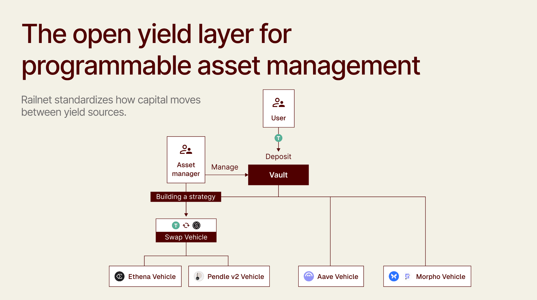 The network effects compound. Build one Vehicle, and it's instantly accessible to every strategy on Railnet. Build one strategy, and it can immediately access every integrated protocol.