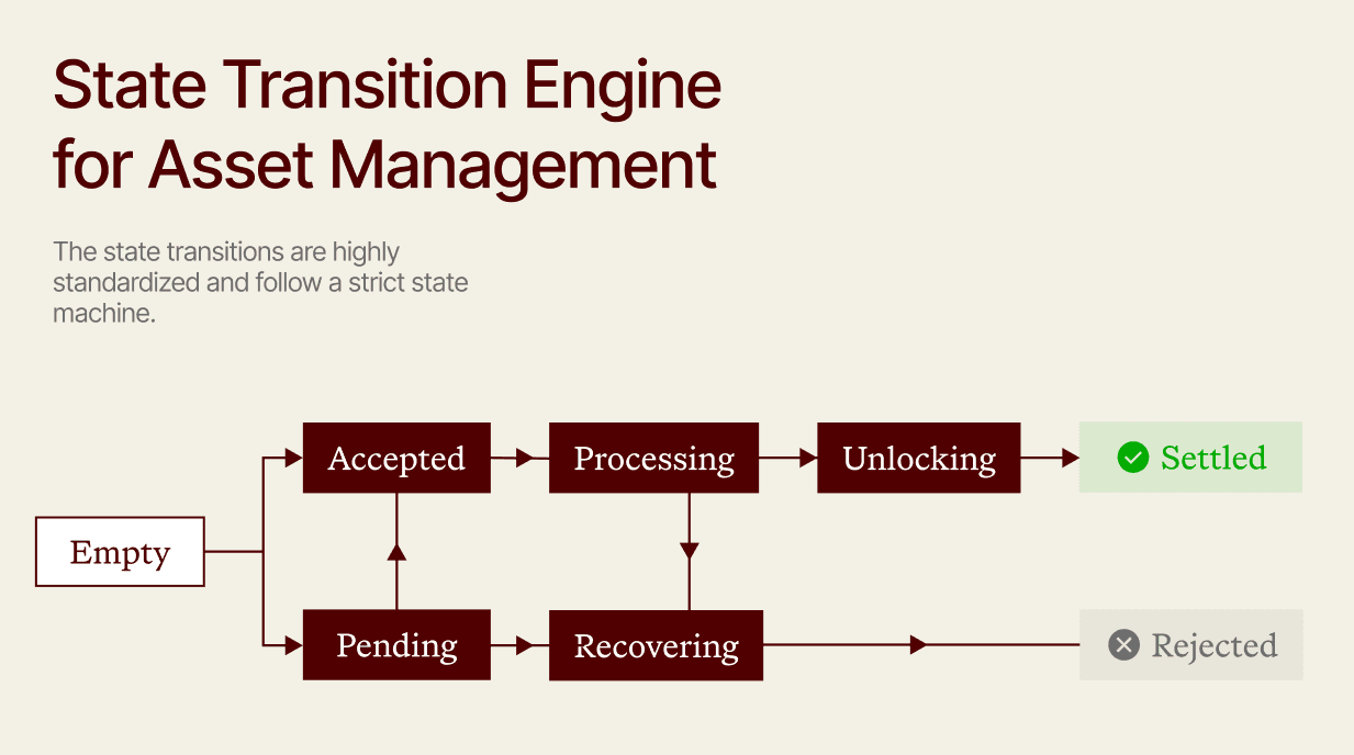 Instead of forcing all operations into the same rigid flow, STEAM models capital movements as state transitions. Every operation, whether instant or multi-day, is expressed as a "query" that progresses through a standardized lifecycle.