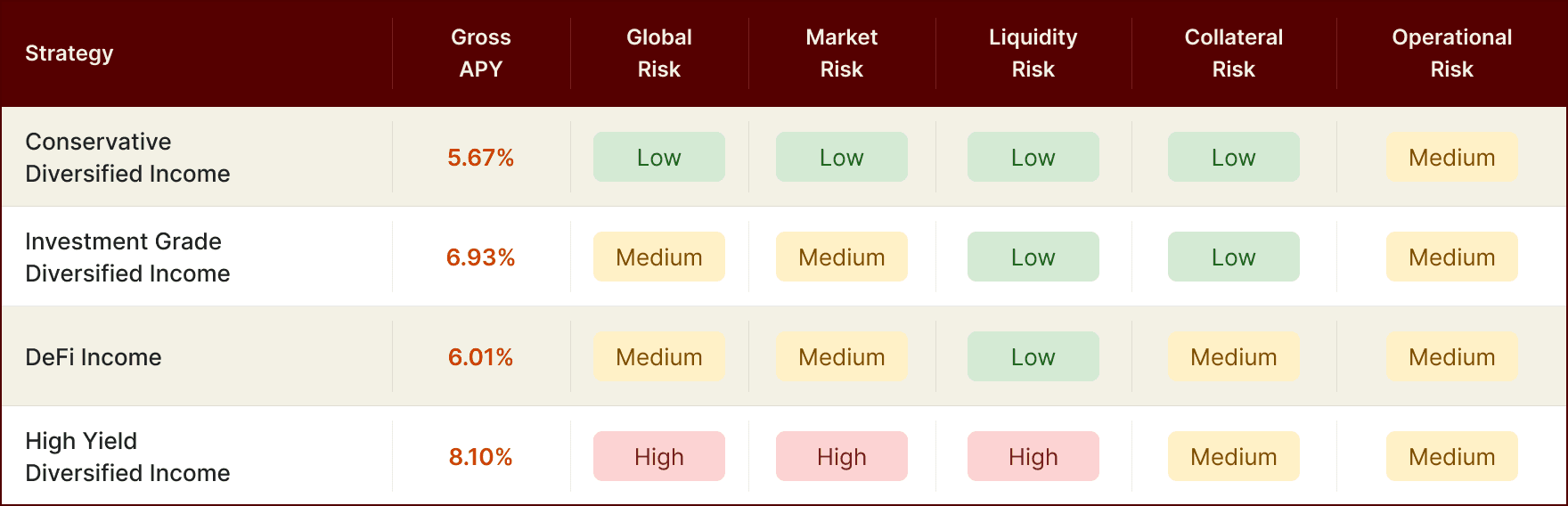CoinShares assigns granular risk ratings across each strategy – global, market, liquidity, collateral, and operational – rather than a single composite score. The Conservative strategy carries low risk across almost every dimension. The High Yield strategy carries high market and liquidity risk but only medium collateral and operational risk.