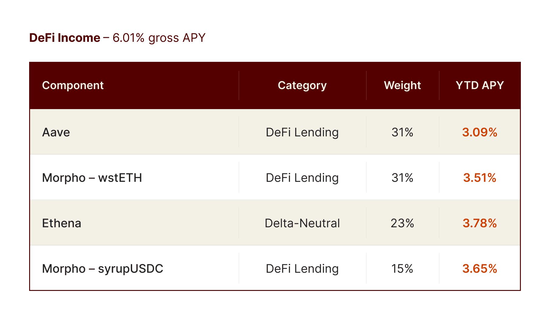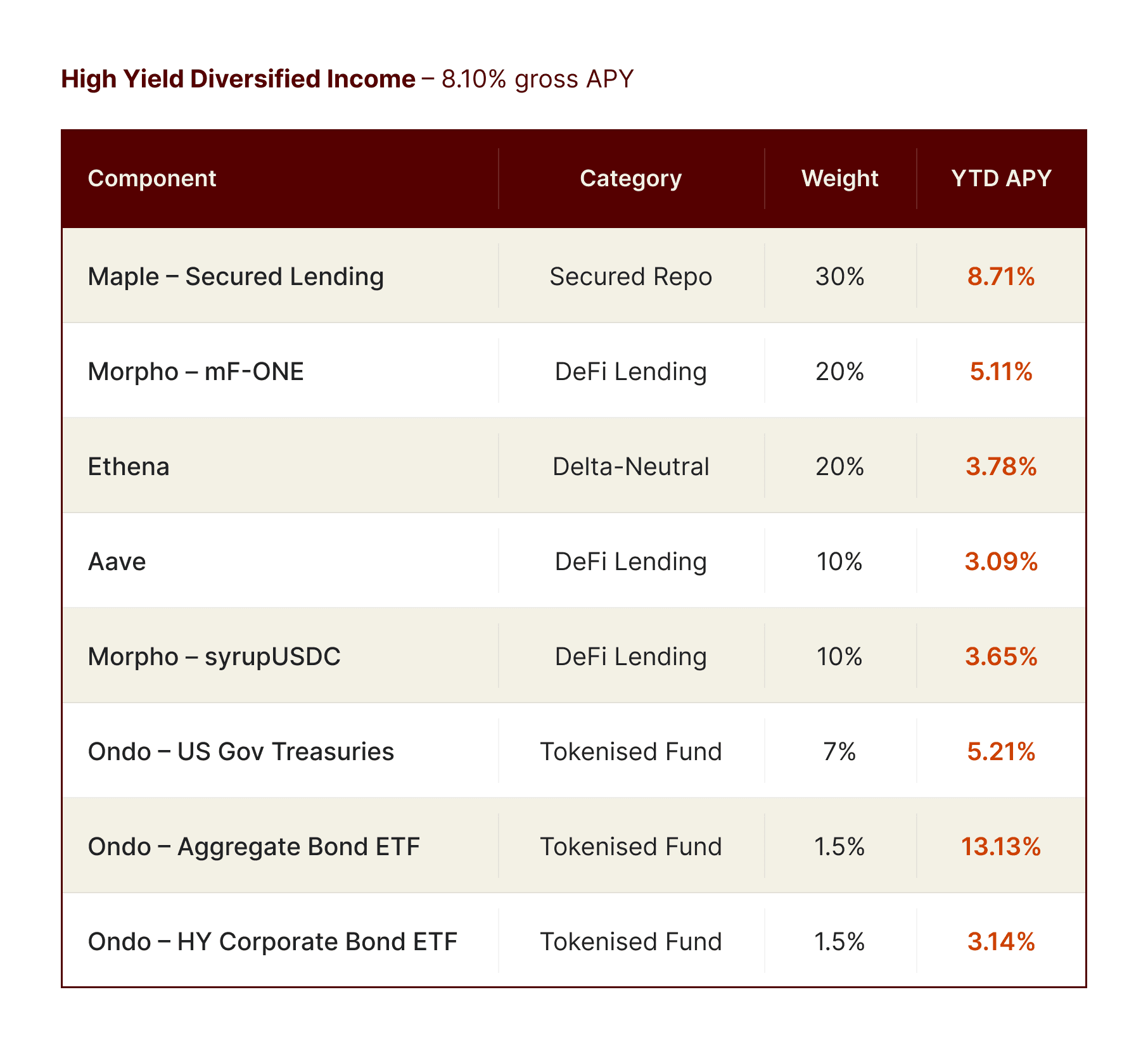 The High Yield strategy illustrates the effect. Monthly returns ranged from 0.37% to 0.84% with an 8.10% gross APY – a wider band than the pure DeFi strategy, but with a higher floor. As DeFi lending rates compress, the non-lending allocations hold value.